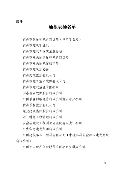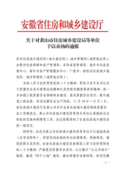 近日,安徽省住房和城鄉建設廳印發《關于對黃山市住房和城鄉建設局等單位予以表揚的通報》,《通報》指出,11月30日-12月1日,省住房和城鄉建設廳在黃山市召開全省住房建設領域質量安全工作推進會,會議效果得到全省住房城鄉建設系統一致肯定,并對在此次會議認真做好組織實施和保障的單位予以通報表揚,黃山市建工集團股份有限公司作為唯一一家本土建筑施工企業榮獲表揚。