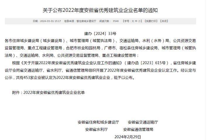 黃山建工集團再次喜獲省住建廳“優秀建筑業企業”榮譽稱號