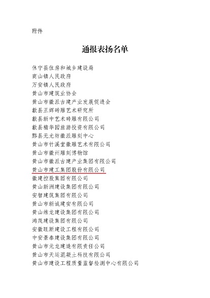市委、市政府于2024年10月24日至25日成功舉辦中國(黃山)第四屆徽派古建產業發展大會。近日,中國(黃山)徽派古建產業發展大會籌備工作領導小組辦公室發布《關于對中國(黃山)第四屆徽派古建產業發展大會中做出突出貢獻的單位給予表揚的通報》,黃山建工集團榮列其中。