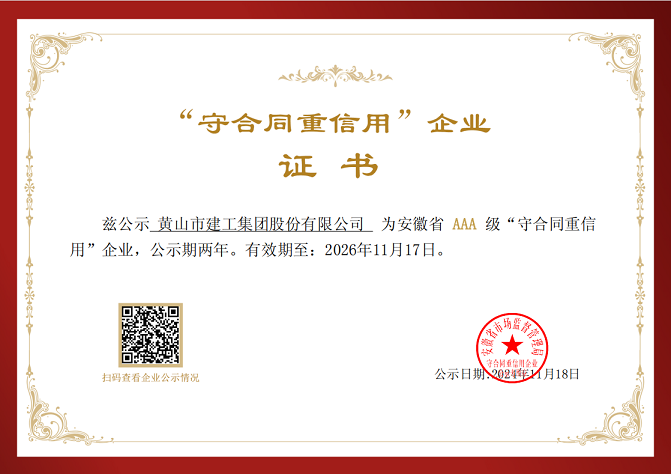 近日,黃山建工集團(tuán)憑借健全的信用管理體系、優(yōu)良的合同履約信用狀況和良好的市場信譽(yù)榮獲安徽省AAA級“守合同重信用”企業(yè)稱號。這一榮譽(yù)的獲得,不僅是對黃山建工集團(tuán)在企業(yè)經(jīng)營過程中始終堅持誠信經(jīng)營的肯定,也是對黃山建工集團(tuán)在合同履行和信用管理方面所取得的顯著成績的認(rèn)可。