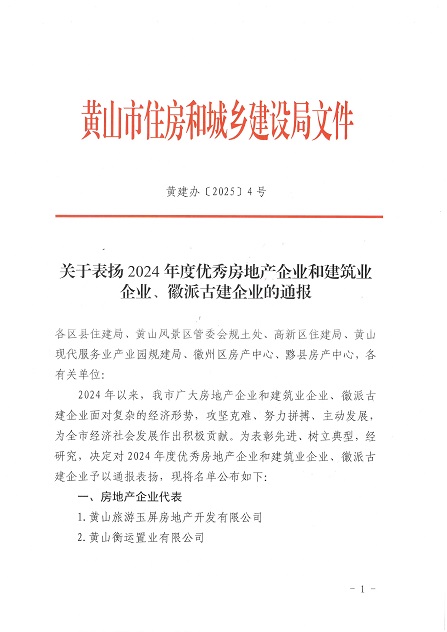 近日,黃山市住房和城鄉建設局發布了《關于表揚2024年度優秀房地產企業和建筑業企業、徽派古建企業的通報》,黃山建工集團榮獲2024年度優秀建筑業企業稱號。